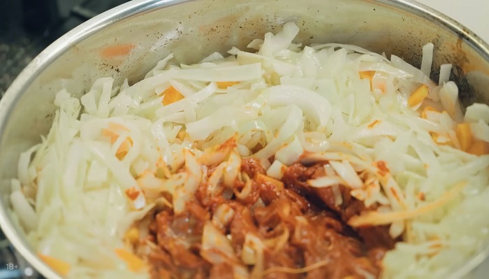 Добавляем капусту, немного обжариваем вместе с овощами, затем добавляем томатную пасту и всё это пассируем. -