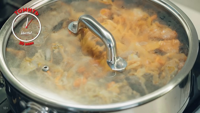 Теперь добавляем мясо вместе с соком которое мы жарили раннее, добавляем немного воды, накрываем сковородку крышкой и томим ещё 20 минут. Вот и всё! Бигос по-Ивлевски готов! Не забудьте перед подачей посыпать его петрушкой :)