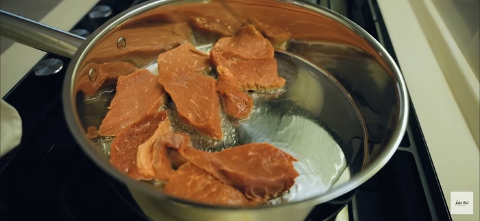 Жарим мясо в большом количестве растительного масла, затем томим. -
