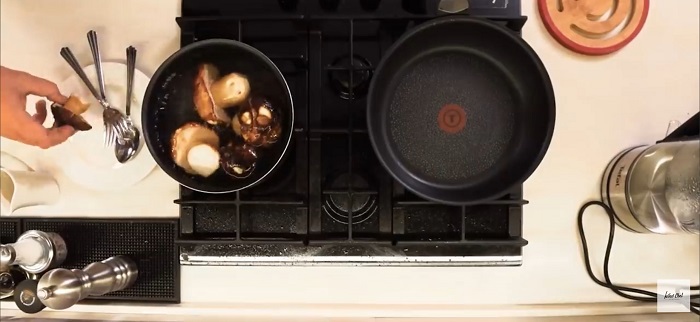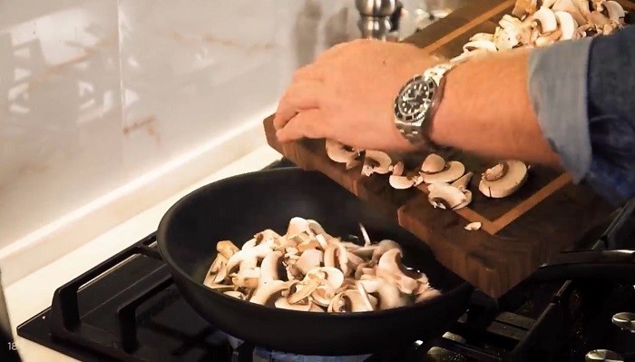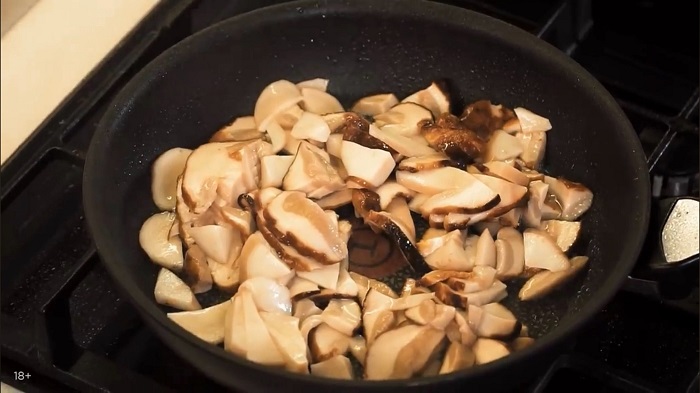 Шампиньоны нарезаем тонкими слайсами, затем обжариваем на растительном масле, солим, перчим. -