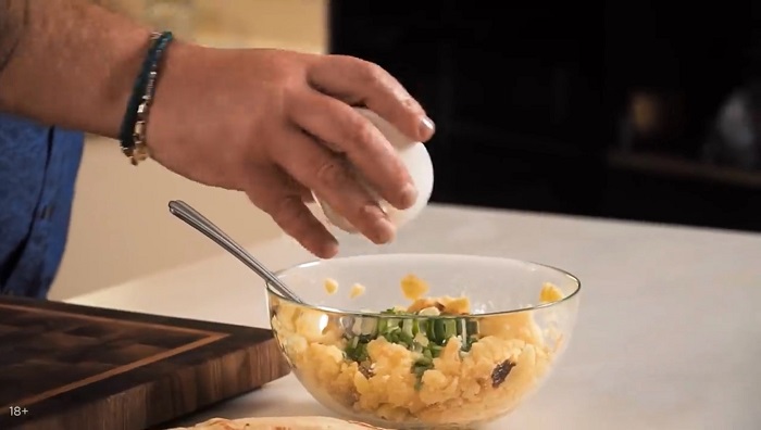 Предварительно запечённый картофель выкладываем в глубокую миску и начинаем толочь, добавляем соли, зелёного лука, перемешиваем. -