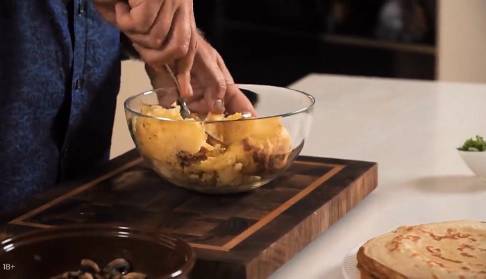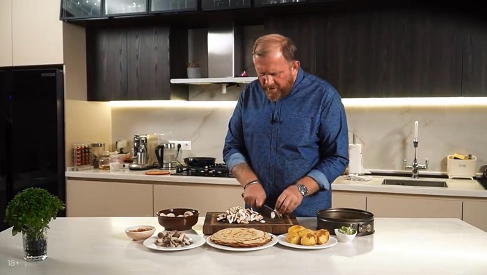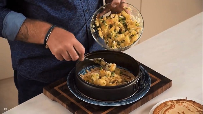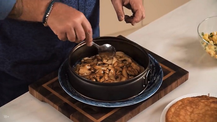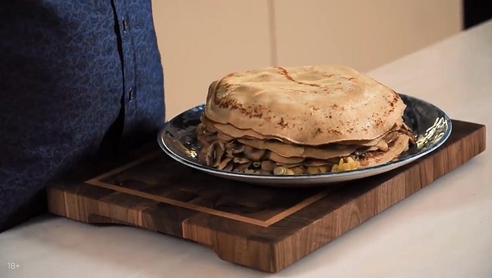 Блинный торт с картофелем и грибами - рецепт от Константина Ивлева