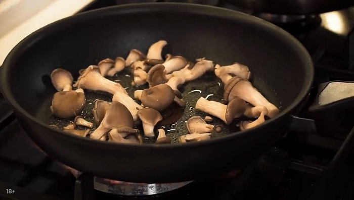 Шампиньоны выкладываем в посуду и начинаем обжаривать вешенки также на растительном масле. -