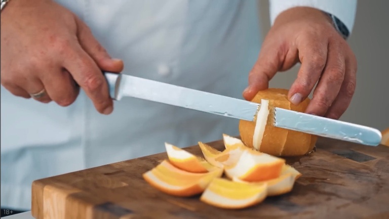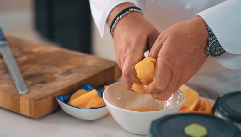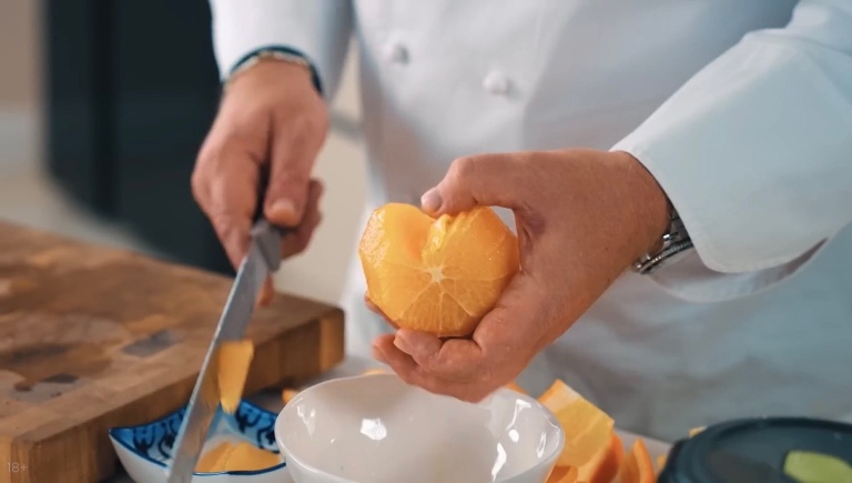 Апельсин очищаем от кожуры, выжмем немного сока, филейным ножом вырежем дольки. -
