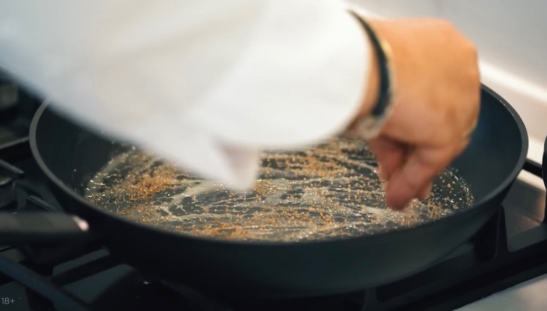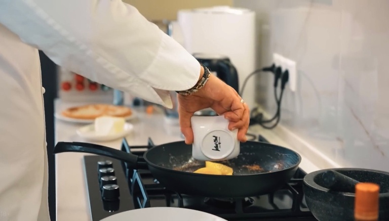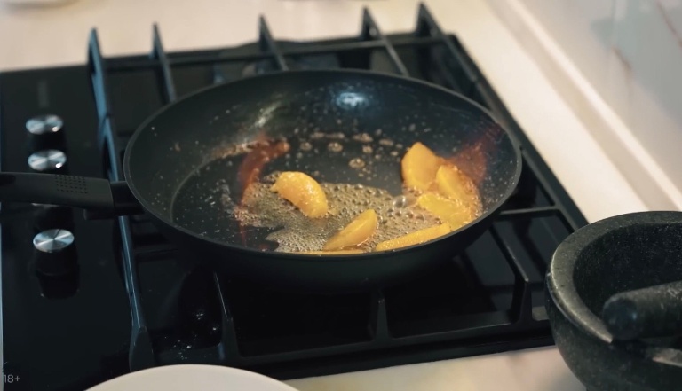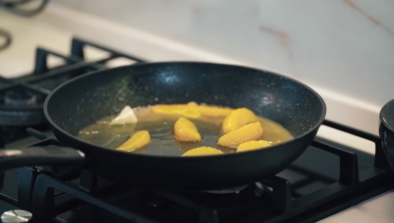 В сковородку отправим наш нарезанный апельсин и зальём его ликером, теперь нужно всё это дело поджечь. -