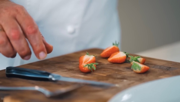 Нарезать клубнику, украсить её блинчики. -