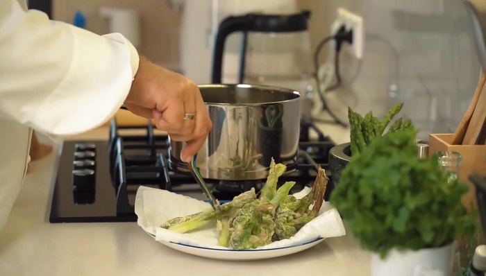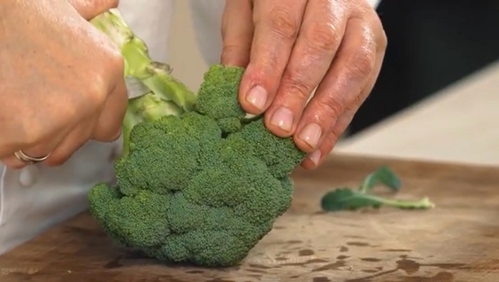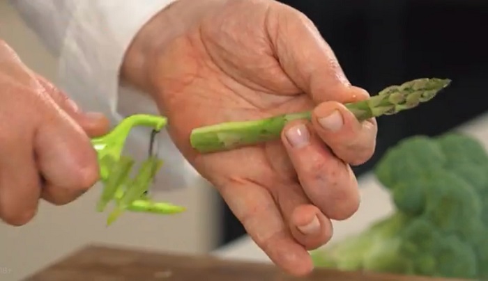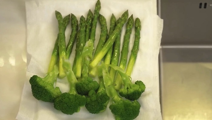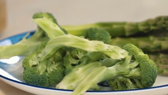 Корешки спаржи слегка подчищаем, брокколи разрезаем на соцветия, так чтобы оставались длинные ножки. -