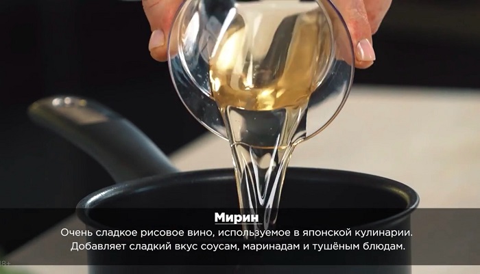 В первую очередь приготовим соус. В сотейник вливаем мирин, добавляем мелко рубленный чеснок, соевый соус, кунжут, сахар и уксус мицукан. -