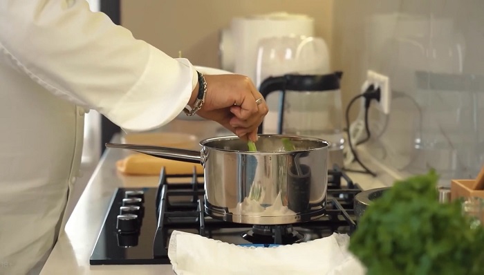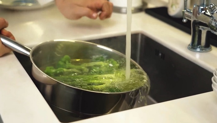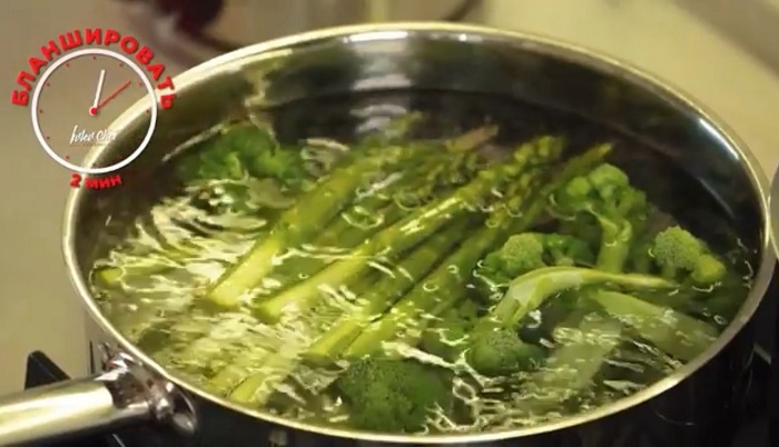 Овощи закидываем в кипящую воду на 2 минуты, затем откидываем их под холодную воду и просушиваем. -