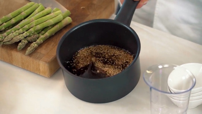Красиво сервируем блюдо, подаем вместе с соусом и наслаждаемся прекрасным вкусом! Хрустящие брокколи и зеленая спаржа с кунжутным соусом готовы!