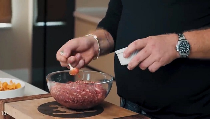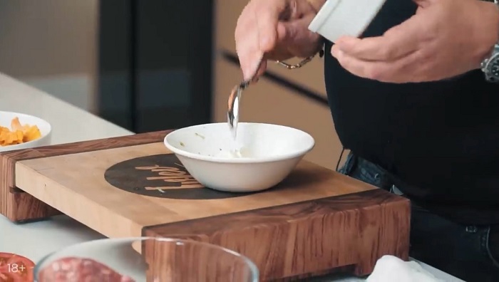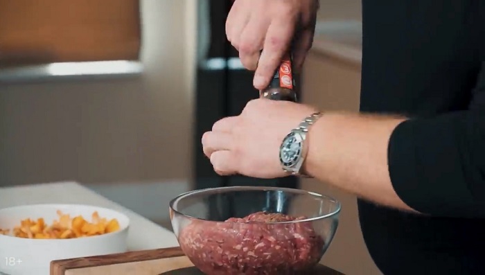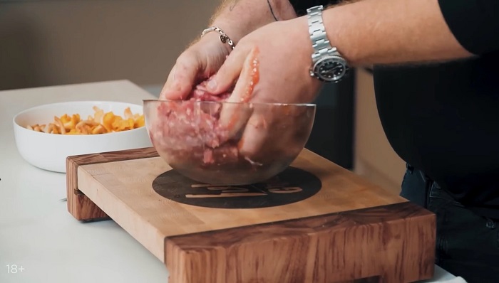 Фарш солим, перчим, добавляем ложечку аджики и кетчупа, замешиваем фарш руками. -