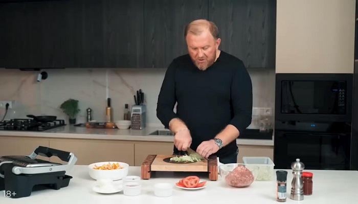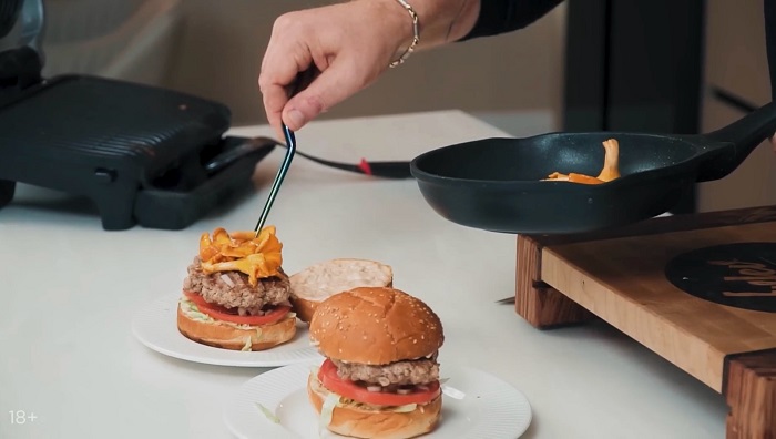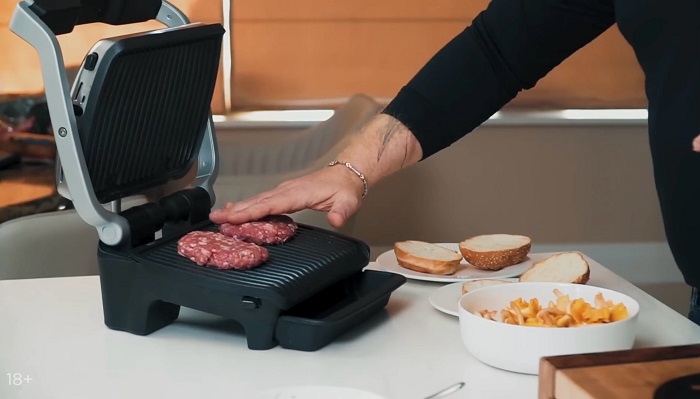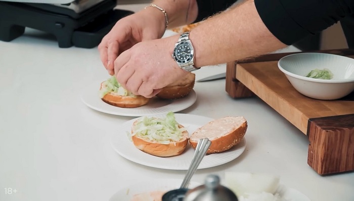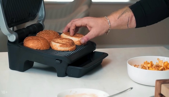 Булочку разрезаем напополам и слегка подсушиваем на гриле. -