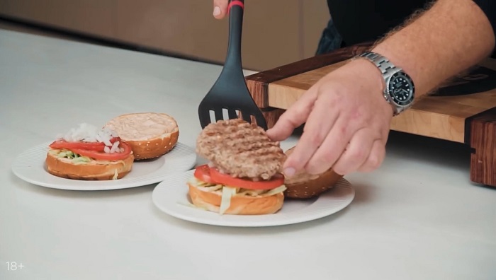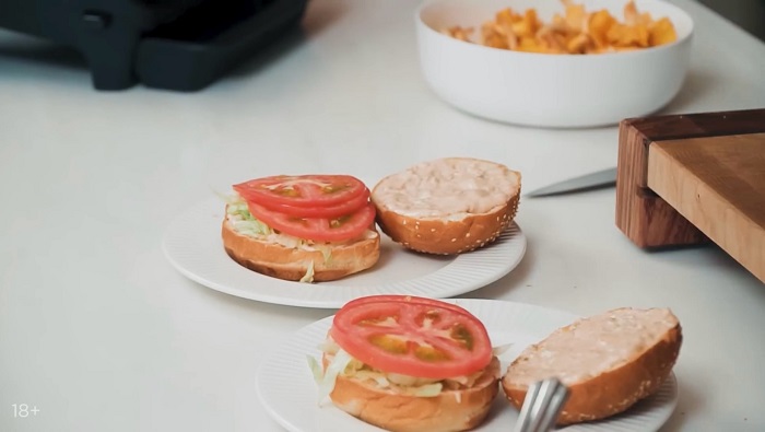 Собираем бургер. В первую очередь булочки смазываем соусом, затем кладем листья салата, томаты, поверх выкладываем лук, затем котлету, затем немного обжаренных лисичек и закрываем все другой частью булочки, тоже смазанной соусом. -