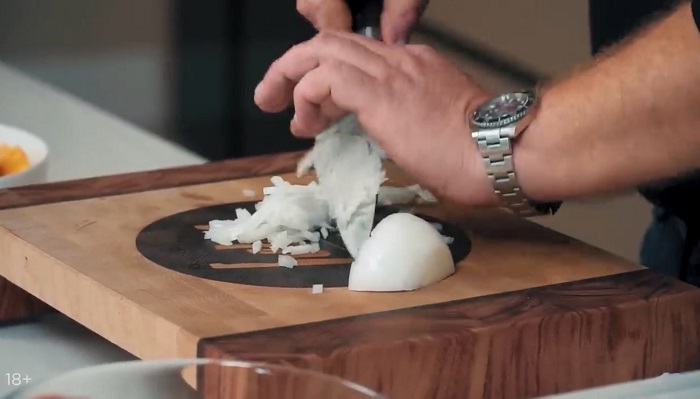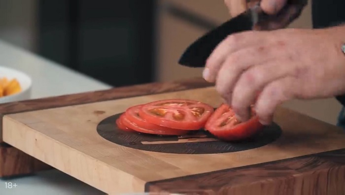 Помидор нарезаем тонкими кружочками, а репчатый лук и салат айсберг мелким кубиком. -
