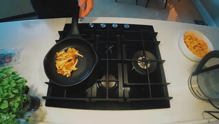 Лисички обжариваем на оливковом либо растительном масле, добавив соли и перца. -