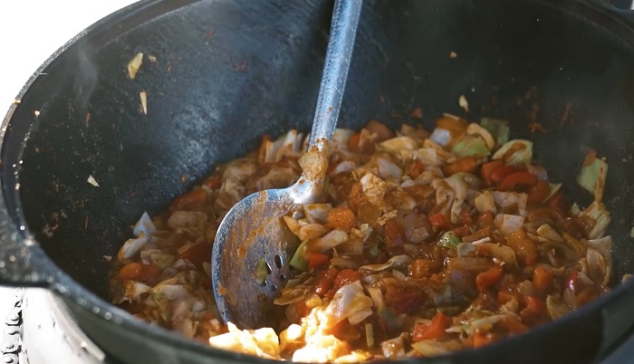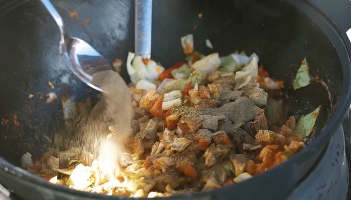 Добавляем специи (сахар, соль, молотый черный перец, зиру, кориандр и паприку), хорошо перемешиваем и томим примерно 7 минут. -