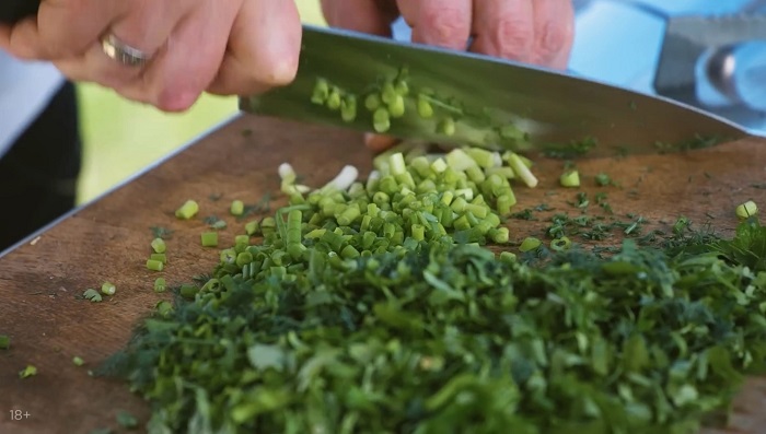 Финальный штрих - мелко нарезаем зелень! Добавляем в соус и вкуснейший, пикантный и ароматный чахохбили из индейки в казане от Шефа готов!