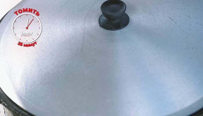 Добавляем воды, немного чесночного масла (пробитый в блендере чеснок с оливковым маслом), забрасываем индейку, добавляем совсем немного чили перца и продолжаем томить еще 25 минут при среднем огне накрыв крышкой. -