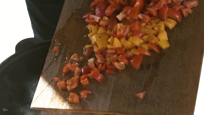 Нарезаем репчатый лук и помидоры. -