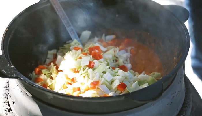 Нарезаем сладкий перец и капусту "шашечками" и забрасываем в казан. -