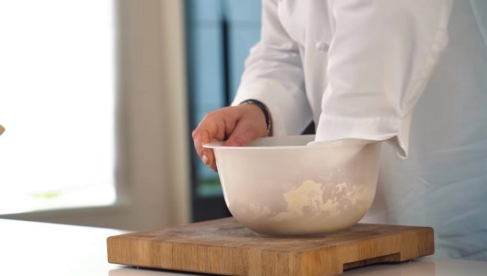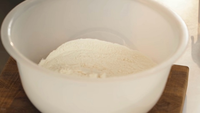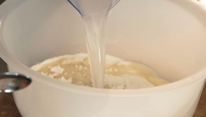 Для теста высыпаем в дежу муку, в стакан с теплой водой вылить немного растительного масла, водки, чайную ложку соли, всё это перемешать и влить в муку. -