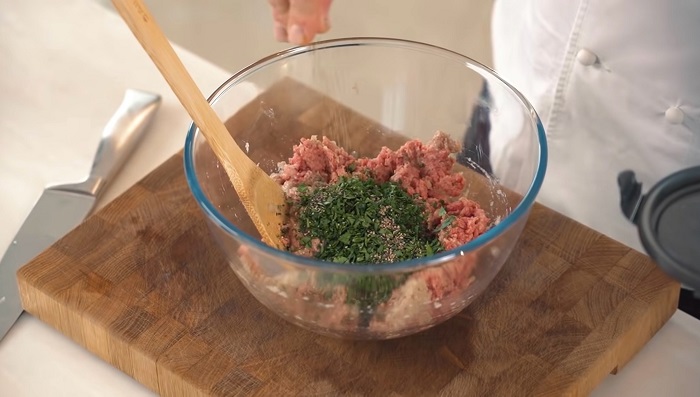 Добавить к фаршу мелко нарезанную петрушку, перец соль, немного растительного масла, воды, перемешать. -
