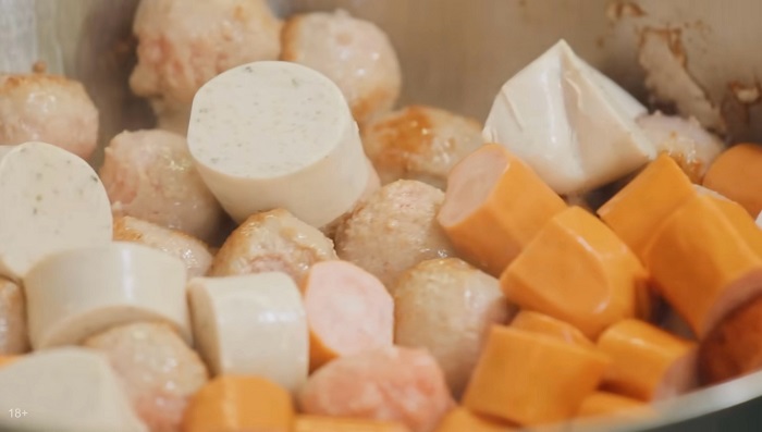 Берём сковороду с большим бортом, обжариваем в ней все копчёности, добавляем чеснок и остальные специи, мешаем. -