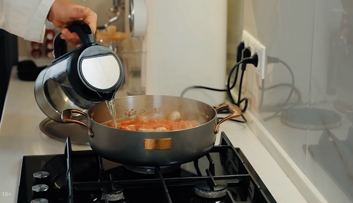 Теперь добавим протертых томатов с небольшим количеством воды, немного сахара, доводим до кипения и томим в течение 3-5 минут. -