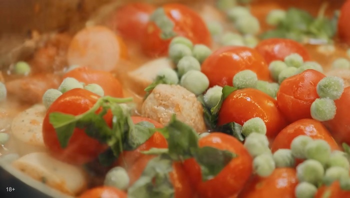 Вводим очищенные томаты черри и зелёный базилик, добавим свеже-мороженного зелёного горошка, томим ещё 3 минуты и дачное рагу по-Ивлевски готово! Подавайте с деревенским хлебом и наслаждайтесь.