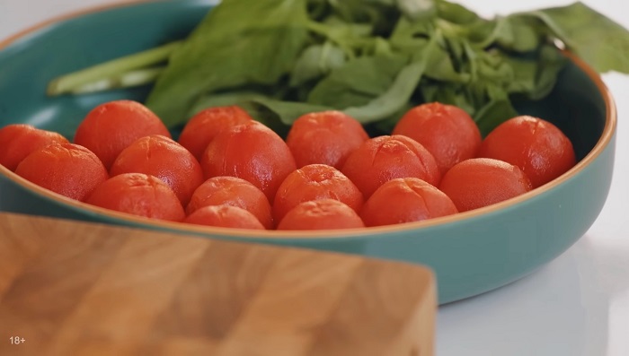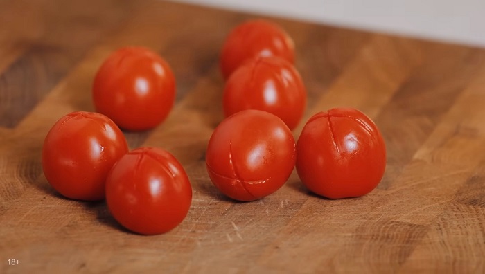 С помидор черри нужно снять кожицу. Для этого делаем на них небольшие надрезы, закидываем в кипящую воду на минуту, и кожица слезет сама. -