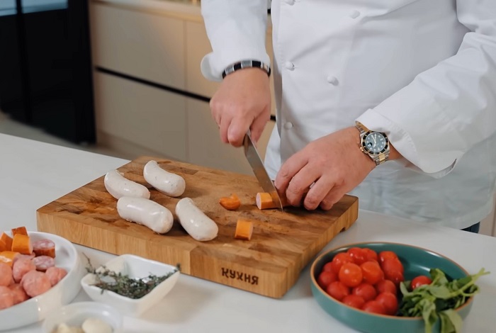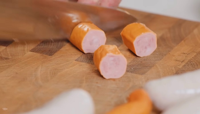 Купаты и другие копчёности нарезаем на крупные кусочки. -