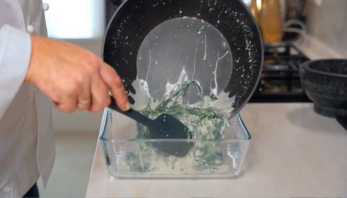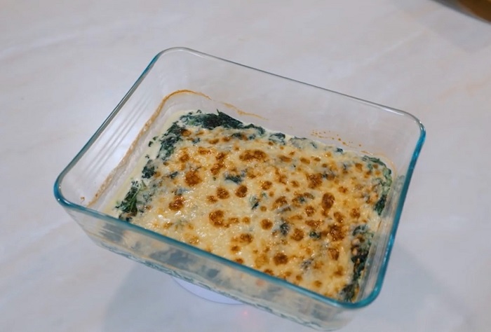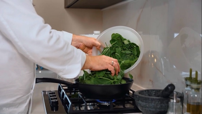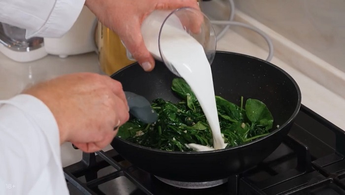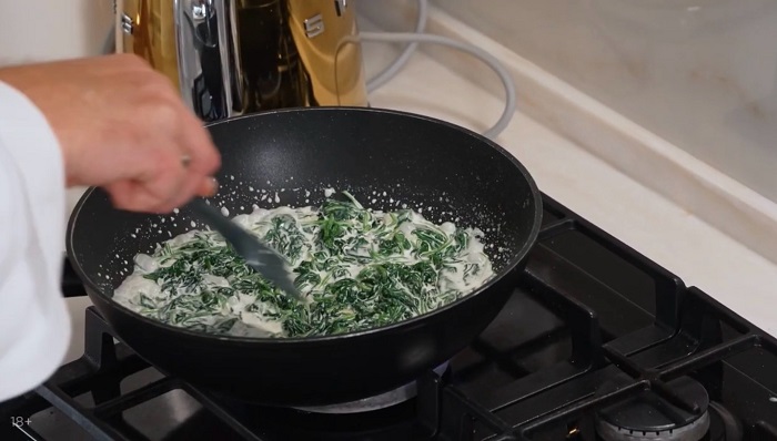 К чесноку выкладываем шпинат, солим и обжариваем, а затем вливаем сливки, добавляем перца, выпариваем и перекладываем в форму для запекания. -