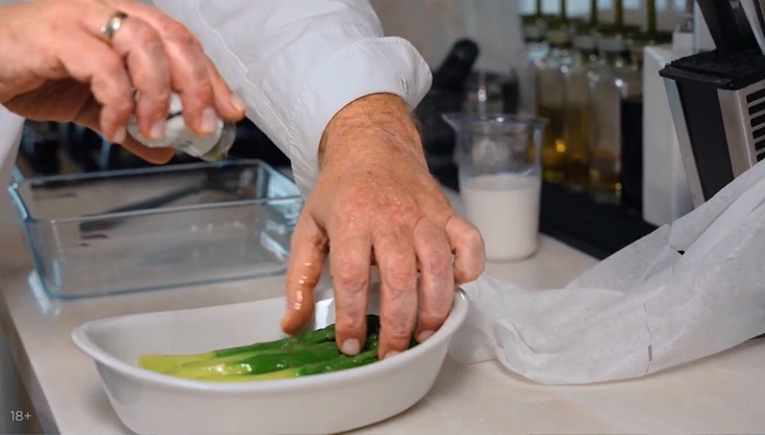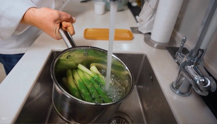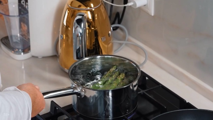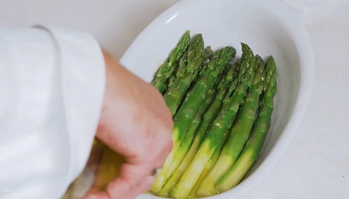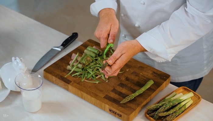 Корешки спаржи зачищаем, опускаем ее в кипящую воду на 1 минуту, а затем откидываем под холодную воду и просушиваем. -