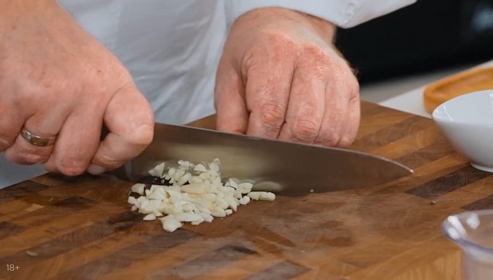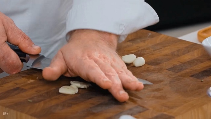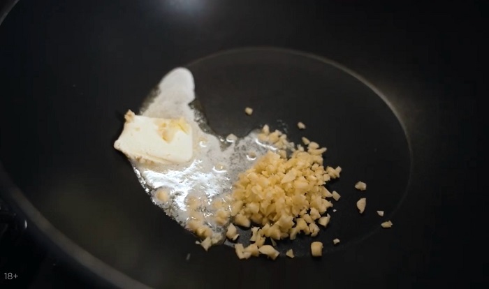 Чеснок раздавливаем и мелко нарезаем, а затем сразу же закидываем его в сковородку с куском сливочного масла и немного обжариваем. -