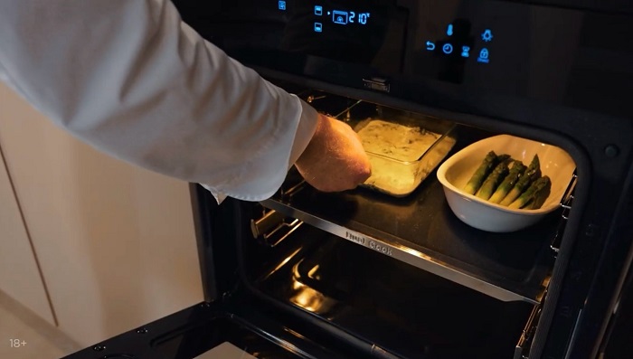 Посыпаем шпинат сыром пармезаном, а спаржу выкладываем в другую форму для запекания, поливаем небольшим количеством оливкового масла, солим. -