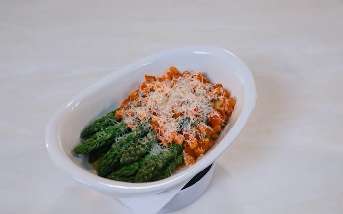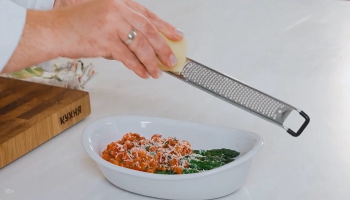 Выкладываем помидоры на спаржу, а сверху натираем сыр манчего. -