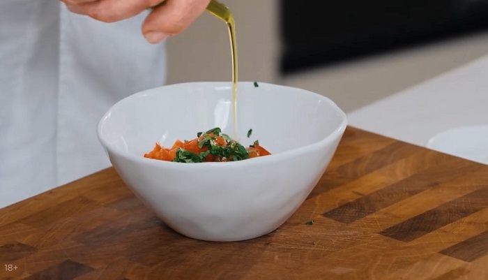 Помидоры и зеленый базилик мелко нарезаем, соединяем, добавляем немного оливкового масла, перца и соли, перемешиваем. -