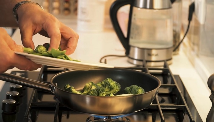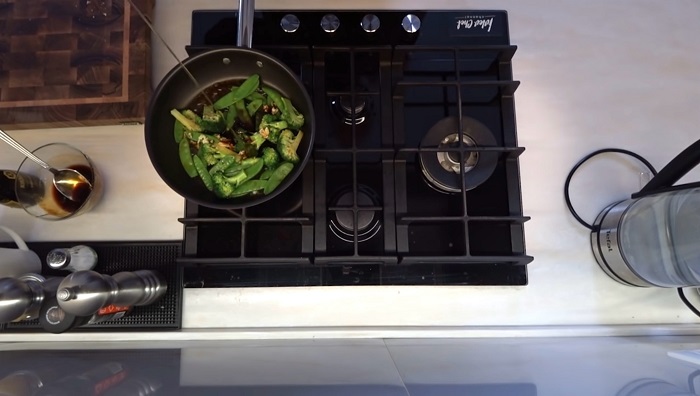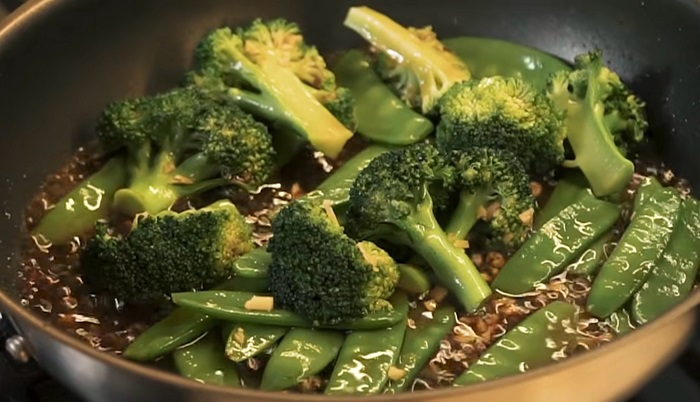 На небольшом количестве растительного масла обжариваем брокколи и зелёный горошек примерно пол минуты. -