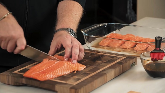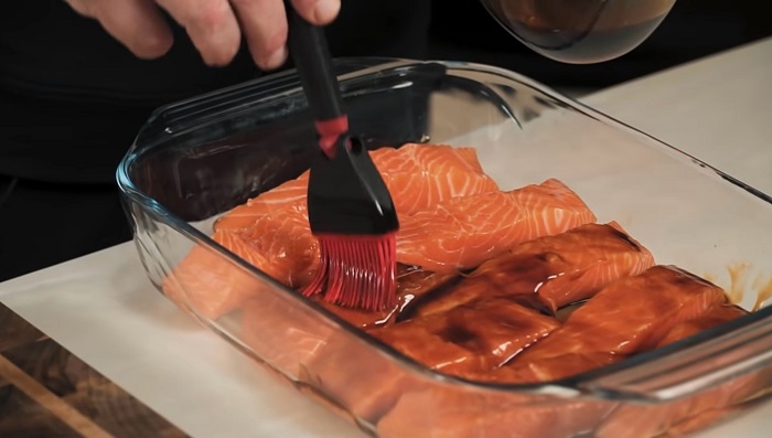 Сверху ещё раз смазываем рыбу соусом терияки и отправляем в духовку, разогретую до 230 градусов, на 10-12 минут. -
