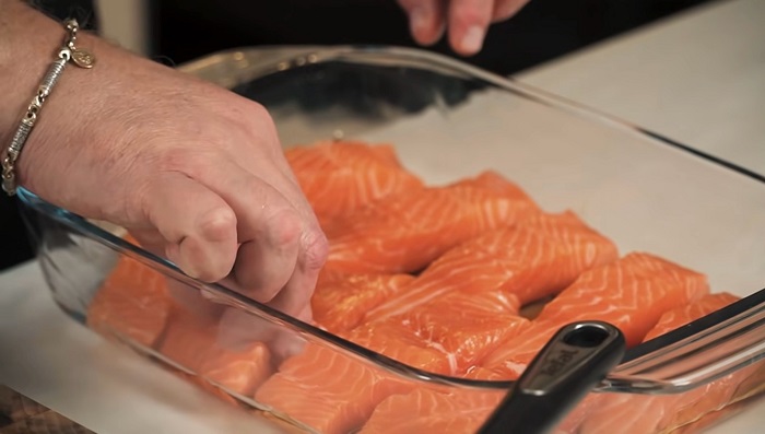 Форель нарезаем некрупными кусками и выкладываем их в форму не сильно рядом друг с другом. -
