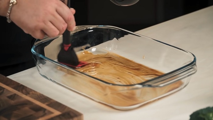 Классическим соусом терияки смазываем дно формы для запекания. -