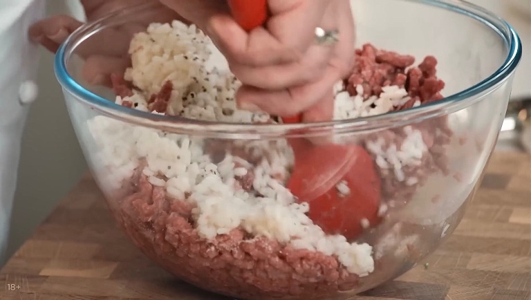 Первым делом смешаем фарш с рисом, посолим, поперчим, перемешаем и чуть добавим воды. -