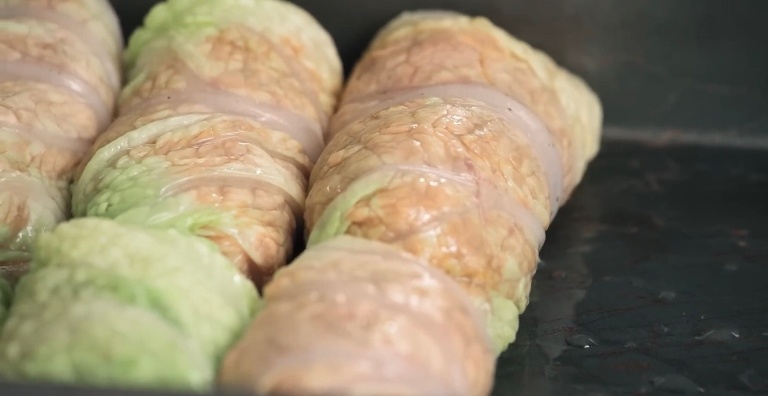 Начинаем крутить голубцы. Берем лоток для запекания, на него выльем небольшое количество растительного масла, лист капусты кладем внутренней частью вниз, накладываем фарш и закручиваем. -