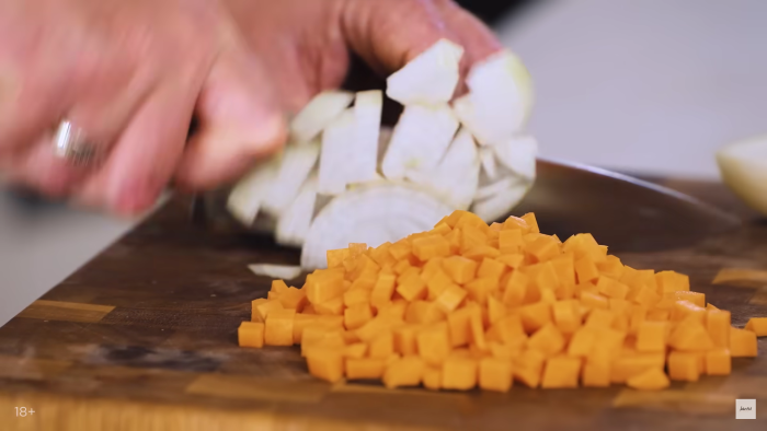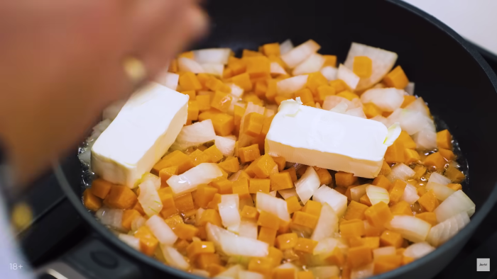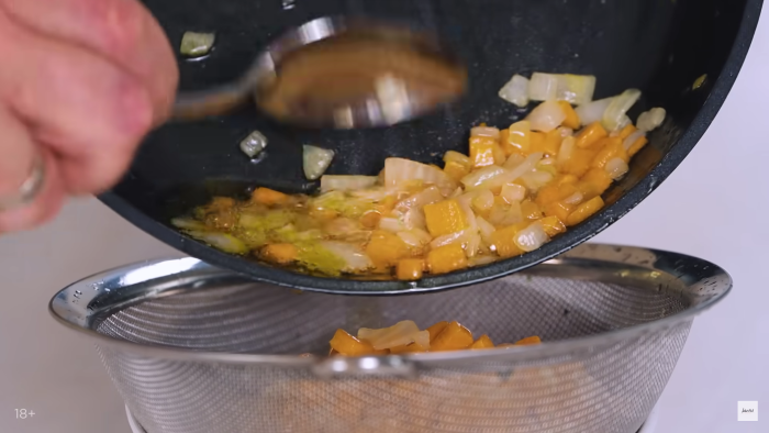 Пассировку делаем и лука и моркови, которые должны быть нарезаны небольшим кубиком. В большое количество растительного масла добавляем овощи и сливочное масло. Обжариваем не до золотистого цвета, а до прозрачности. Затем процеживаем через сито, чтобы избавиться от масла. -