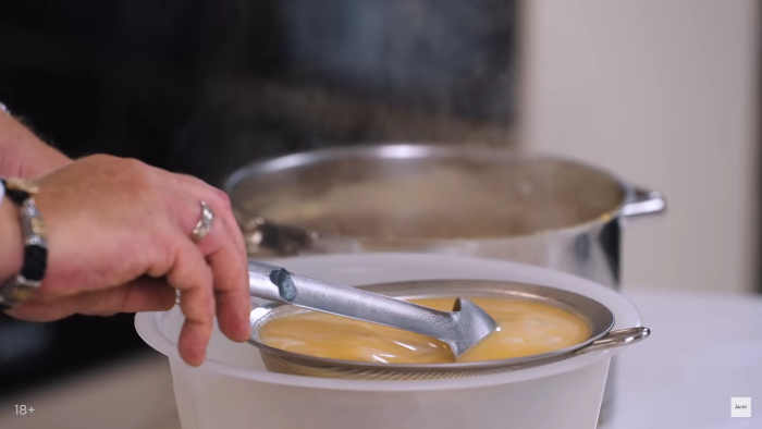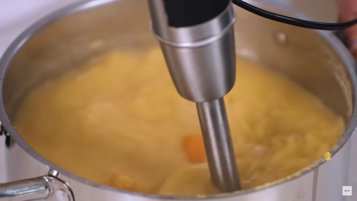 Из готового бульона, который проварился 1 час, достаём рёбра ,а всё остальное перемалываем в блендере до консистенции пюре. Процеживаем данное пюре через сито, чтобы избавиться от комочков. и выливаем обратно в кострюлю. -
