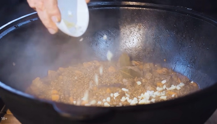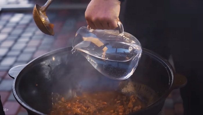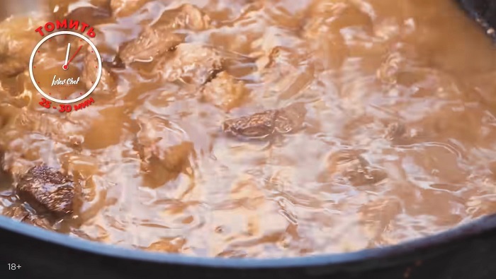 Добавляем воды, соли и оставляем мясо томиться 25-30 минут при среднем кипении. -