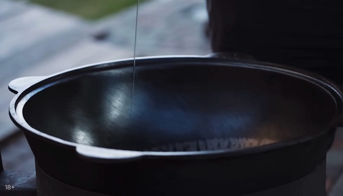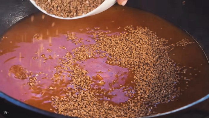 Добавляем еще немного воды и вводим гречку, накрываем казан крышкой и даем гречке провариться 10 минут. -