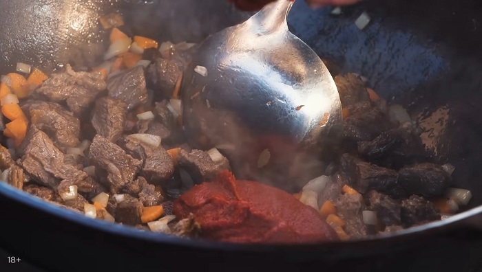 Закидываем морковь и репчатый лук, вводим томатную пасту, мешаем, прижариваем пару минут. -