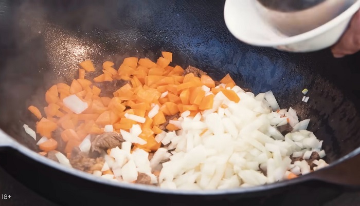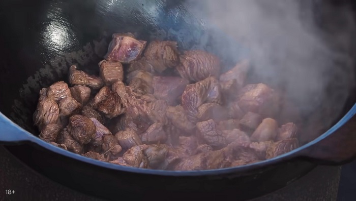 В казан вливаем растительное масло и обжариваем нарезанную кубиком говядину. -