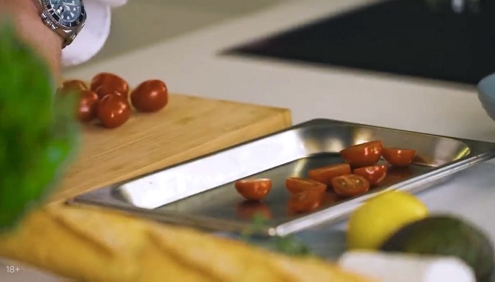 Черри томаты режем пополам, выкладываем в лоток для запекания, солим, перчим, посыпаем тимьяном, поливаем оливковым маслом и ставим в разогретую до 200 градусов духовку на 5 минут. -